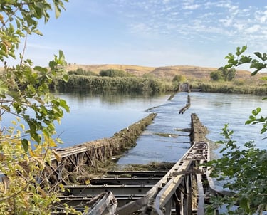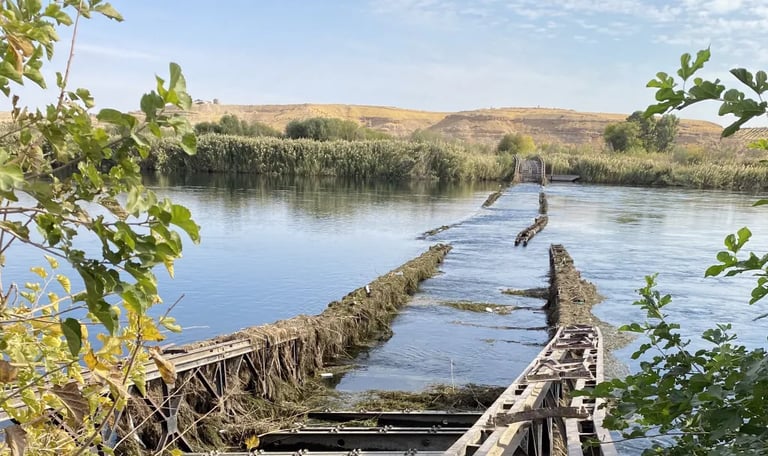 Remnants of a collapsed bridge spanning the Euphrates River, with a military post visible in the upper left corner. The image reflects the securitization of space and the material legacies of war, highlighting their enduring impact on connectivity, livelihoods, and territorial control.