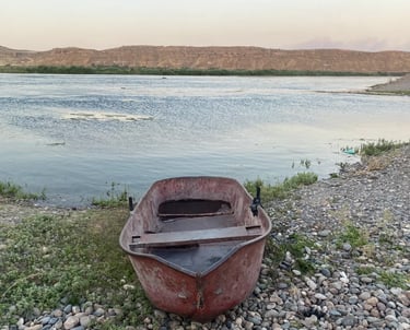 A weathered boat rests on the banks of the Euphrates River. The stillness belies the layered histories of movement, displacement, and survival