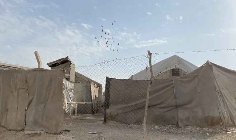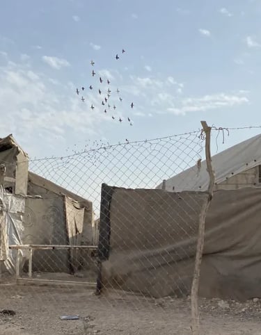 A flock of birds soars above improvised tents in an IDP camp in northern Syria, contrasting with the physical and political constraints on the ground. The image evokes the tension between confinement and the enduring human desire for freedom, dignity, and movement amid protracted displacement.